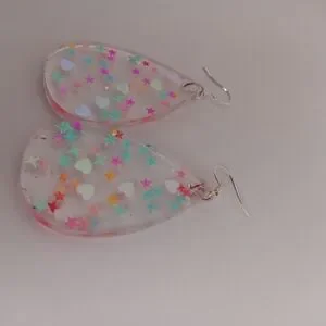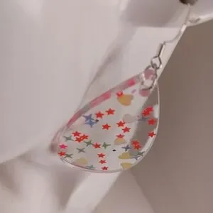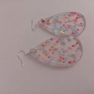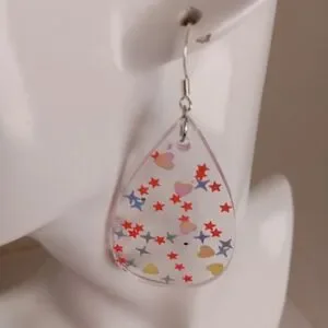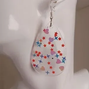 Clear teardrop earrings with colorful star and heart accents. Perfect for adding a playful touch to any outfit. sterling silver ear wires