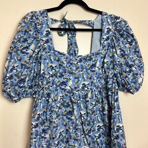 Jacquie The Label Watercolor Floral Print Puff Sleeve Tie Back Babydoll Dress