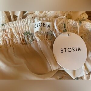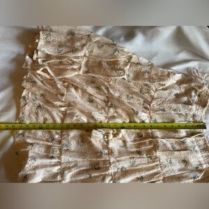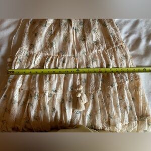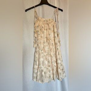 Perfect for spring and summer. Bridal shower, errands, BBQ. Stay cool and look chic. Cream dress is lined. Eyelet lace and subdued florals add the perfect amount of charm to this dress. Straps are self tie and adjustable. The perfect swing mini dress
