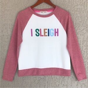 Wallflower, Colorful Rainbow Colors, I SLEIGH Graphic, Pullover, Lightweight Sweatshirt. I SLEIGH front graphic. Long raglan sleeves. Ribbed neckline, hemline & cuffs. Lightweight and very soft, 95% polyester 5% spandex. Size large. See photos for measurements to ensure fit.