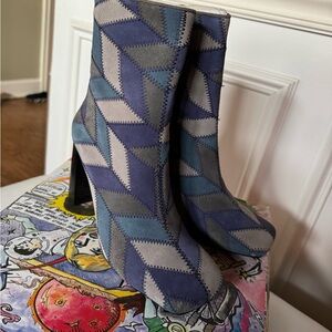 New in box. Size 8. Blue multicolored suede leather uppers. 3” heels. Colors of blue, gray & purple. Side zip. These are sold out everywhere.
