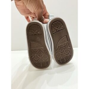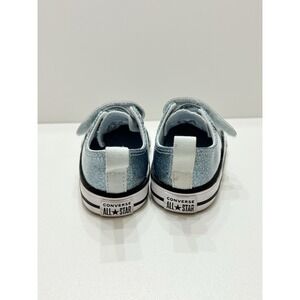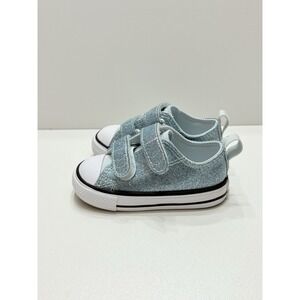 The product is a pair of Converse metallic glittered blue sneakers in size 5c for toddlers. These athletic shoes are designed for both boys and girls, making them a versatile option for young children. The vibrant blue color and sneaker style add a fun and stylish touch to any outfit, perfect for active kids on the go. With the trusted Converse brand, these shoes combine comfort and style for a fashionable choice for little ones.