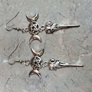 Raven Skull Moon Star Silver Dangle Earrings