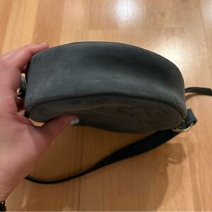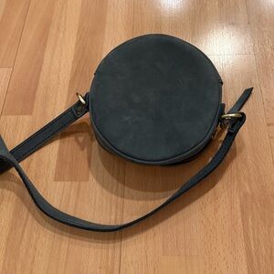 Stylish round crossbody bag by Portland Leather. Crafted from quality leather. Perfect for everyday use. Soft suede in a deep grey blue. Great condition. Fits a phone nicely.