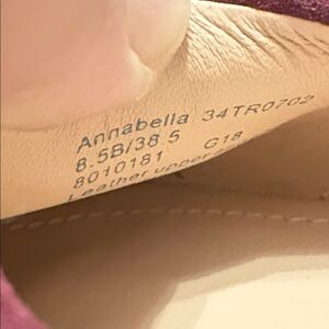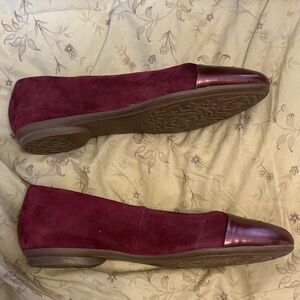 This pair of Taryn Rose Annabella Ballet Flats has been worn. They are a size 8.5. They have a light scratch on the toe of the left shoe (pictured). They have light scuffing and wear on the bottoms. The footbeds are clean and show no obvious signs of wear.