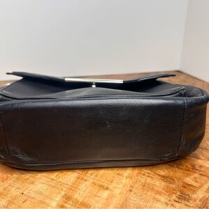 Sleek black leather design. Features adjustable strap. Perfect for everyday use.