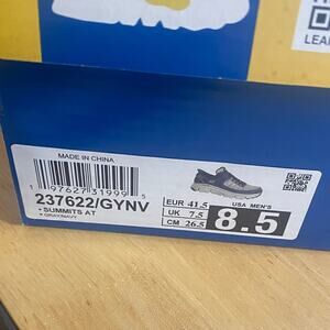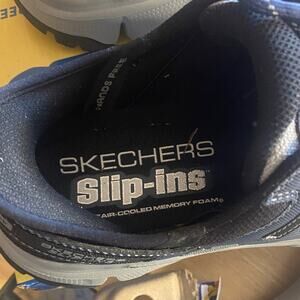 Stylish Skechers Slip-Ins with memory foam. Easy wear and comfort. My husband wore these around the house before determining they were too small. The cardboard inserts are torn but still work.