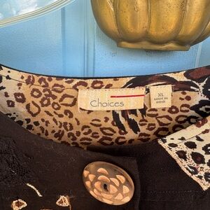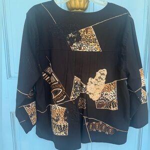 Stylish black jacket with intricate tan patterns. Features unique button detail. Perfect for layering.