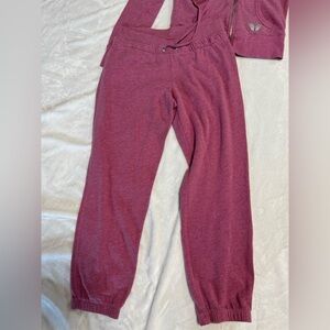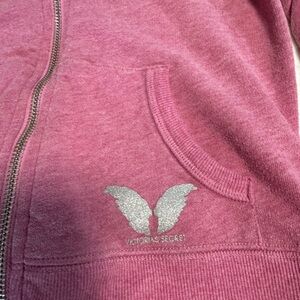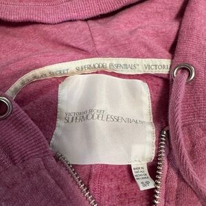 This is a gorgeous soft pink Victoria Secret set. It was from their no longer existing collection of Super Models. Was a limited edition. Pants are joggers with a cute V waist with pull strings. Back top shiny silver wing logo. Hoodie is a full zipper down with pull strings. Two front pockets. Also has matching VS logo and wings on the front. Both size Small but can also fit a medium due to the stretchy material.