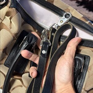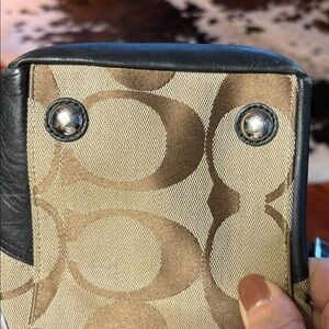 Stylish Coach shoulder bag with signature canvas. Features black leather accents. Perfect for everyday use.