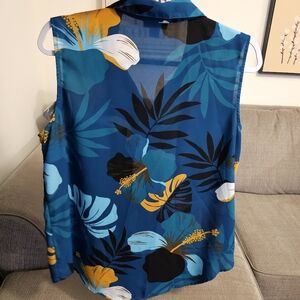 Vibrant sleeveless blouse with a floral pattern. Features a button-up front and a stylish collar.