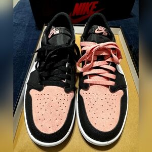 Nike Air Jordan 1 Retro Low OG sneakers in black, coral, and white. Iconic style with a bold design.