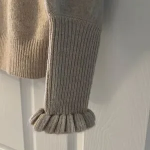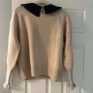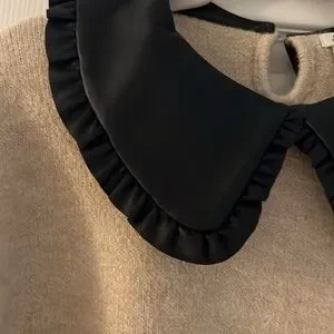 Chic cream sweater with a black leather ruffled collar. Perfect for versatile styling.