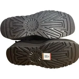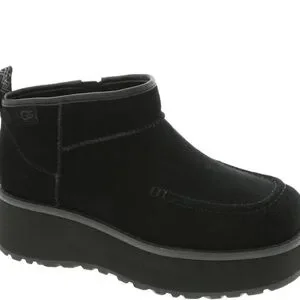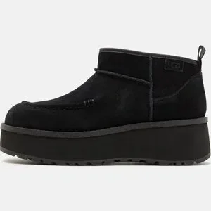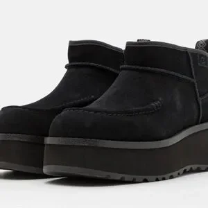 Elegant UGG boots with a sleek platform. Crafted in black suede for a modern touch. Step up your style with these authentic UGG women’s platform ankle boots in classic black suede. Featuring a chunky lug sole and cozy UGG comfort, these trendy boots are perfect for everyday wear while adding height and edge to your look.