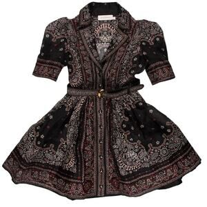 A standout mini dress from Zimmermann’s Matchmaker collection featuring a bold bandana-print in black, tailored short length, and structured shirt-dress silhouette with front button closure and belt loops.