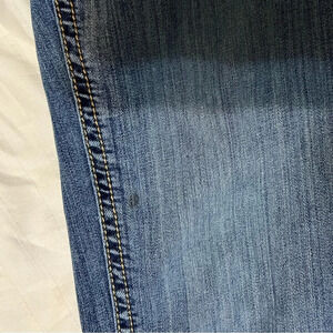 Small stain on front by knee area and distressed area on upper leg. See pictures. Otherwise very good condition