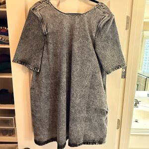 Stylish mini dress with a washed black finish. Features a relaxed fit and short sleeves. Perfect for casual outings.