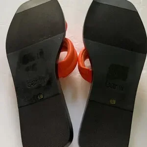 Preowned. All man made material. Soft Plush quilted straps, square toe, cushion insole and metallic studding at welt.