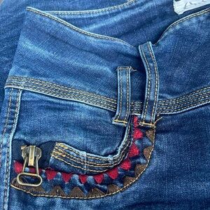 Artka - unique blue jeans - low rise skinny jeans - red and brown embroidered around pocket and large nonfunctional zipper pull on front pockets - back pockets with flap over and button - 3 snaps at leg hem - in good pre owned condition - size 25
