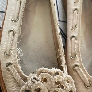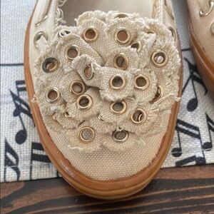 Yves Saint Laurent Cream Canvas Rubber Sole Grommeted Riveted Flower Toe Flats