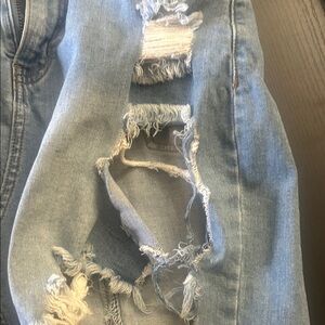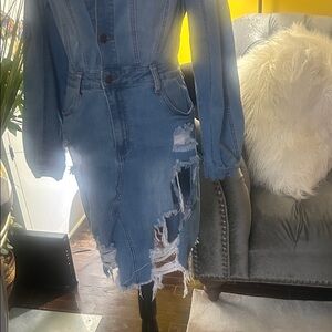 Stylish denim dress. Features distressed details. Perfect for casual wear. Some strings hanging on by a thread. Super distressed. Shown in pictures.