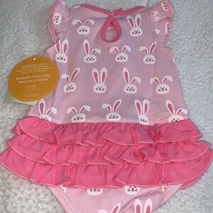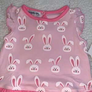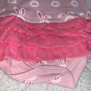 Adorable 🐰 pink ruffle bodysuit with bunny heads printed on it! Perfect for Easter time or whenever! Would also make a great gift!