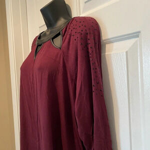 This is a maroon and black tunic with cut outs in the neck area and rhinestone on the shoulders in excellent used condition, has an extra button replacement attached to the garment. From a smoke free home.