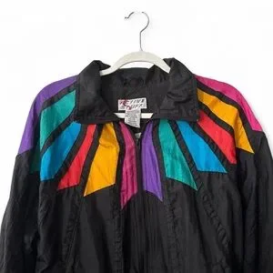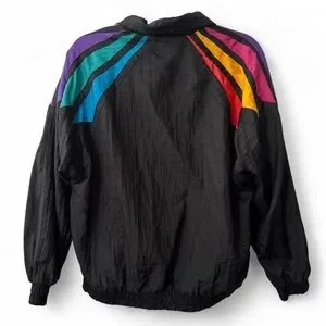 Vintage black windbreaker with colorful geometric detailing. Lightweight, zip-up style with elastic cuffs and hem.