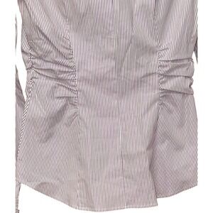 Keywords: striped shirt, button down, stretch fabric, jeweled buttons, ruched detail, business casual, office wear, tailored fit, long sleeve, smart casual, sophisticated