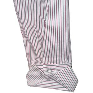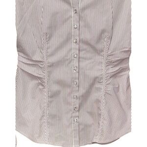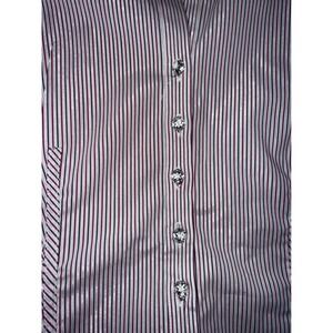 A sophisticated metalic B7striped button-up shirt from New York & Company. This fitted shirt features a classic collar, long sleeves with buttoned cuffs, and eye-catching jeweled buttons down the front. The ruched detailing at the sides adds a flattering shape. Perfect for business casual occasions or a polished look for evening events.