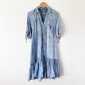 Free People Maya V-Neck Oversized Button Down Midi Shirt Dress in Blue size XS. Effortlessly cool Free People Maya midi shirt dress in a soft blue wash. Features an oversized, relaxed fit with a flattering V-neckline, button-down front, short sleeves, and functional pockets. Designed with intentional light distressing for a lived-in, bohemian vibe—perfect for vacation, layering, or everyday wear.