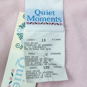 NWT Size 1X Vintage Quiet Moments Nightgown. A tiny snag on the backside but otherwise really nice vintage condition! V-neck front with a sheer panel of stretchy lace at the waist. Long length, either midi or maxi depending on your personal height. Smooth and stretchy lightweight pink nylon fabric.