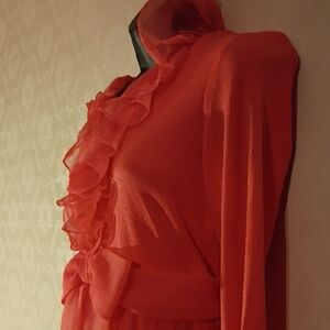 Vintage 60s? Coral flowy fairycore style maxi dress. Chic long sleeve maxi dress with ruffle details. Features a stylish bow at the waist. Perfect for elegant occasions, photo shots, parties, travel. The zipper does stick a bit. This dress is stunning. Good used condition, just the sticky zipper .