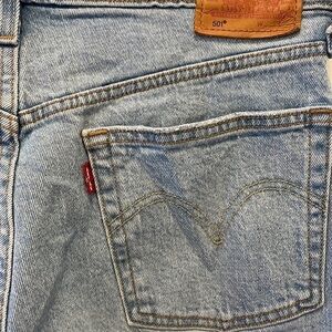 Levis Light Wash Frayed hem button fly 501. Size 30. EUC. Levis tape on sides. Mildly distressed. Approximate measurements waist laying flat 16”, Rise 11”, Inseam 2”. The first 4 images are for inspiration only and not for sale. The listed item is featured in the remaining images. 99% Cotton, 1% Elastane.