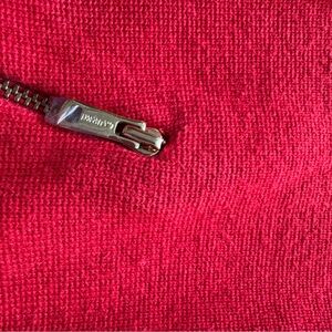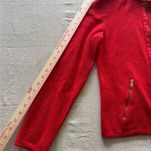 Chic red sweater jacket with zippered pockets. Elegant design with gold hardware - zippers still have plastic protective covering over them. Only worn once and dry cleaned after - that’s the tag over the clothing tag. In excellent condition!