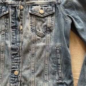 Light blue denim jacket with classic collar. Button front and chest pockets. Only worn several times and dry cleaned after - that’s the tag over the clothing tag. In excellent condition!