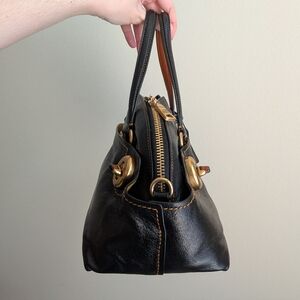 Coach 1941 outlaw satchel with brass hardware. Comes with crossbody strap, but does NOT come with a dust bag. There are creases throughout the bag, fading on the four corners (pic 11), and scratches/fading on the brass feet (pic 12).