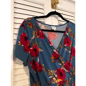 Kalleigh Blue Floral Faux Wrap Dress – Short Sleeve Fit & Flare, Size L