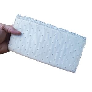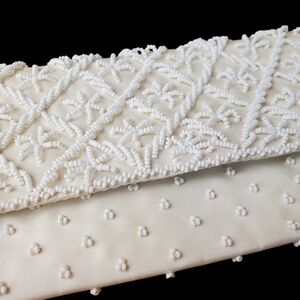 This chic ivory beaded clutch adds elegance to any outfit. Perfect for special occasions.