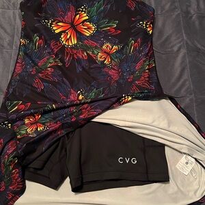 Strapless dress featuring a vivid butterfly pattern. Bold and colorful design. Perfect for standout style.