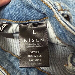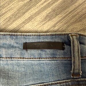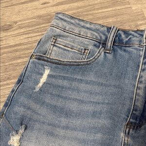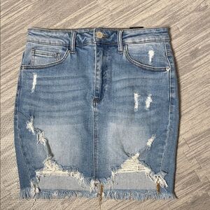 Elevate your style with this chic distressed denim skirt. Perfect for casual outings, this blue skirt adds a trendy touch to any outfit and features a classic five pocket design with a button and zip closure. The skirt is made from 95% cotton, 3 1/2% poly, and one percent spandex giving it a soft and stretchable feel. Waste 30 inches length 18 inches.