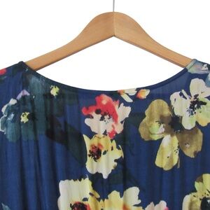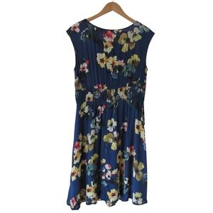 Charming navy dress with vibrant floral pattern. Sleeveless design. Ideal for casual outings.