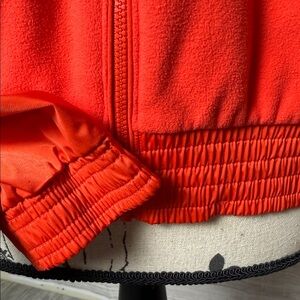 Dynamic coral satin and fleece jacket with a modern design. Ideal for a standout style. The jacket features satin sleeves and accents along with fleece panels, elastic cuffs and waistband and two functional snap pockets. Perfect as a transition or layering piece. Pit to pit 23 inches overall length 21 inches.