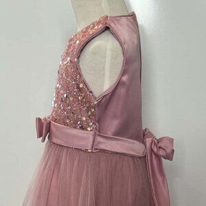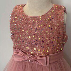 NEW Girls party dress with a shimmering sequin bodice, satin bow waist, and layered tulle skirt. Comes from dog friendly and smoke free home. International size 120. US size 6.