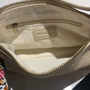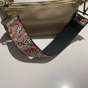 Keywords: crossbody, textured, embroidered strap, floral detail, neutral, versatile, chic, day to night, designer inspired, fashionable, stylish, small bag, clutch