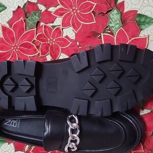 Chic black loafers by NOBO. Features a bold silver chain. Ideal for versatile styling. New, never worn. No box.