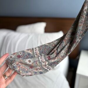 Colors: sage green/gray as the base; floral pattern has: burgundy, blue, white, orange and yellow