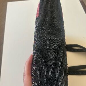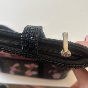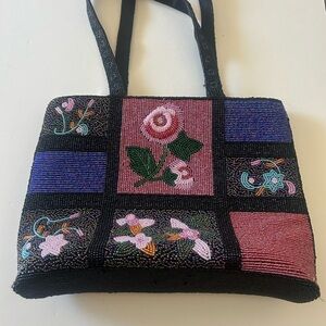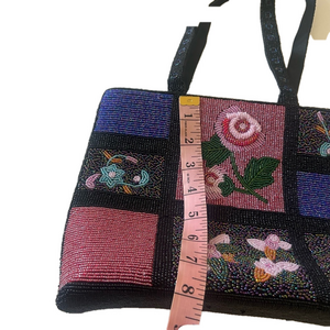 This stylish shoulder bag showcases a unique patchwork design with vibrant floral beading in black and pink hues. Its sturdy black straps ensure comfortable carrying, making it a perfect accessory for any occasion. The bag's eclectic style adds a touch of elegance to your ensemble. This bag has beading everywhere. There is no name brand on it, but it is a stunning bag. See photo of bottom looks like a a few snags. Please see photos for measurements if you have any questions or need more photos, please ask.