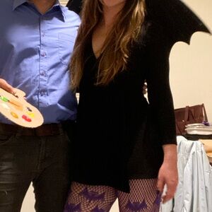 Super short mini wrap black dress from American Apparel. Thick, stretchy fabric makes it perfect for layering or a costume dress (how I wore it).