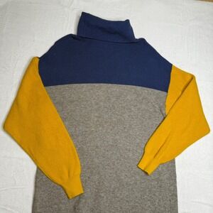 Keywords: Free People sweater, turtleneck, color block, contrasting sleeves, cozy knit, relaxed fit, casual wear, fall fashion, winter style, statement knit, pullover, crew neck alternative, mustard yellow, navy blue, heather grey